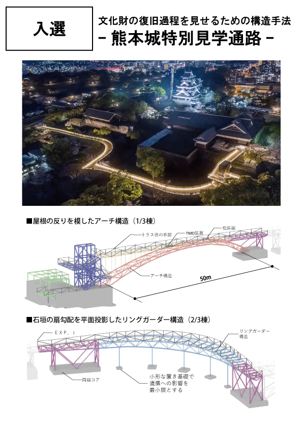 【講評】2018年の熊本地震で大きな被害を受けた熊本城では、復旧の工事が進んでいる。工事の終了までに20年がかかるとされ、その間も一般見学者が安全に場内を巡れるようにした。そのための仮設通路の計画である。国の特別史跡であることなどから、地面の掘削は不可、既存樹木を残す、工事車両と動線を分けるといった特殊な設計条件が課せられた。これに応えるため、歩行者通路を支える構造として大スパンのアーチやリングガーダーなどの手法を場所ごとに採用。少ない置き基礎で、遺構への影響を最小限に抑えた。カーブしながら空中を進んでいく通路の形状は、非常にダイナミックなもの。地震による崩壊は痛ましいできごとだったが、期間限定の見学施設に工夫を凝らすことによって、新たな熊本城の観賞体験がもたらされたとも言えそうだ。アーキニアリング・デザインの意義を、地元の人々や観光客にわかりやすく伝えてくれるプロジェクトである点を高く評価したい。(磯)