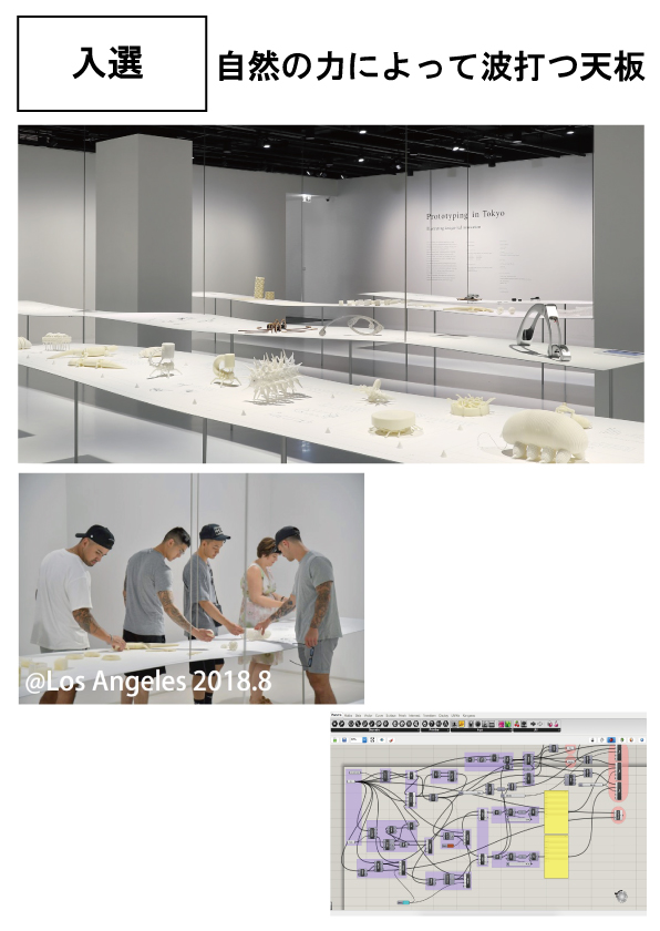 【講評】今回の応募作品の中で数少ない家具の提案であるが建築家と構造家の共同により、小さな構造体の新たな可能性を示した提案である。3次元的に波打つ天板を3.2mmの薄い鉄板と1.9mmφの脚という極めて繊細な部材で構成している。その複雑な形状を導き出すために重力による自然のたわみ具合を確かめながらスタディを繰り返し、展示のリズムに合わせた波のピッチを見つけ出すという、極めてアナログできめ細かい検討から始めている。最終的にはプログラムをつくって形状シミュレーションを行い予測通りの形状を見出している。不確実で非線形な中に存在する美しい形態の実現を目指すため、トライアンドエラーとコンピューターによる検証という繊細で複合的アプローチを行い実現している。コンピューターの解析だけでは到達しにくい合理性を超えた美の分野に挑戦する試みとして素晴らしい試みであるが、作品が生みす繊細な美がもう少し理解し易い表現が欲しかったと思います。(堀越)