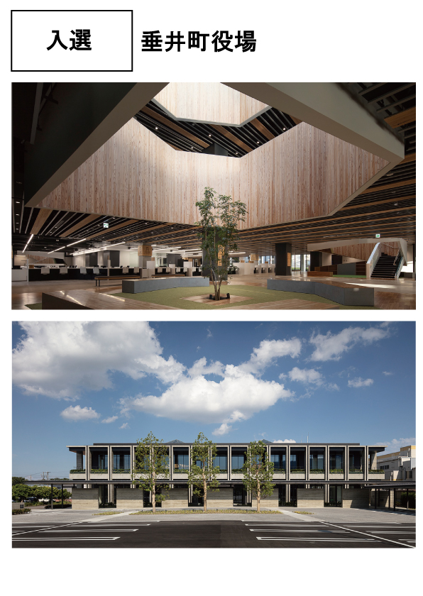 【講評】商業施設を役場庁舎へとコンバージョンしたものである。防災拠点としての機能を強化するために、既存建物の床壁の一部を含む減築を実施。自重を軽減すると同時に、外周部に鉄筋コンクリートのアウトフレームを設けた。これにより外観の印象も一新し、新たなシビックコア・ゾーンの整備をリードする施設であるということをメッセージとして伝えている。内部で特徴的なのは、スラブを解体することで4箇所に設けた吹き抜けで、トップライトにより自然採光や自然通風がもたらされる「環境井戸」として機能する。そしてその下は、人々が集まるコミュニティスペースとなっている。大型商業施設の撤退により空いた建物を庁舎へとコンバージョンする事例は全国で見られるが、地域のシンボルとなり人々の交流をうながす優れた公共建築として成立しているものにはなかなか出会わない。垂井町役場はその数少ない例外のひとつと言える。(磯)