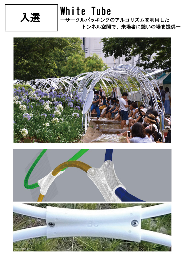 【講評】インスタレーション的な作品の中で、単純な構成で安全かつ簡単に大きな範囲に展開している案として最終選考に残りました。東京ミッドタウンの庭園の小川に呼応する長い造形を軽量で手に入りやすいフラフープで作り出しています。大小いくつかのフラフープを『サークルパッキング』のアルゴリズムを使いランダムに組み合わせて、複雑にカーブする水の流れに沿って連続する立体トンネルを生み出していること、3次元造形技術を利用して解析し3Dプリンターで11種類のジョイント部材を作成することで実現している等、先端技術とローテク部材で実現していることは興味深い。台風の時期に、多くの子供達や大人が集まるイベントとして、安全であることを踏まえ、揺れながら柔軟に力を受け流す素材とディテール、構造がこの作品を実現させている。ただ残念なのは、ヴォールト上の構成は連続するアーチ状の鉄の棒で支えられており、この部分は改良の余地が有ると考えられる。(堀越)