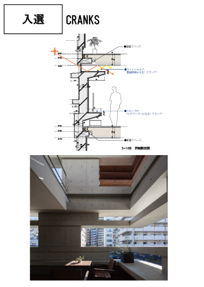 【講評】都市の高密度の敷地に計画される住宅は一般的に地盤、防災、耐震、防音、杭、コストという都市型建築の持つ共通の問題を抱えている。この提案は密集地域の都市型住宅の新しいモデルの提案である。具体的には特殊な壁式RC造と在来木造の混構造で諸問題の解決を目指している。この実現のためのアイデアはタイトル名の様に“CRANK”することで壁厚と重量を抑えて水平垂直力を効率的に負担できる特殊なRCの外壁であり、そしてその形状が木造梁の受け皿として機能し、開口部周りのライトシェルフやカウンターとしても機能している。さらに周囲を耐震