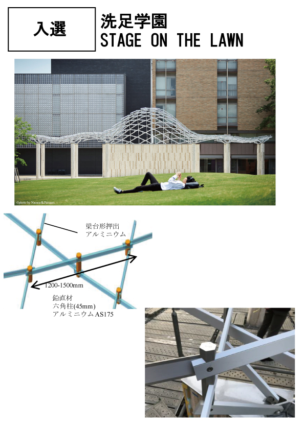 【講評】音楽の専門教育を行なう学園のキャンパスにある屋外ステージで、昼休みやイベントの際には演奏会が行われる。その上に架かるパーゴラ状の屋根である。アルミの線材をつなぎ、カゴメ状に編んでいくことによって、3次元の自由曲面を生み出している。全体形状の決定から構造設計、そして精巧ではあるがシンプルな接合部のディテール検討まで、デジタルデザインの手法を活用した。アルミ部材の製作もデータの受け渡しにより、高い精度で実現させている。これにより施工も簡略化され、特殊な重機を用いず人の手によって短工期でつくることができたという。建築に使われる素材として、木材はローテックでアルミはハイテックといったような思い込みがあったが、このプロジェクトでは日本の木造建築に見られる伝統的な継ぎ手を想起させる接合方法をとることで、アルミという素材を、ハイテックであると同時にローテックでもあるものと再定義している。(磯)